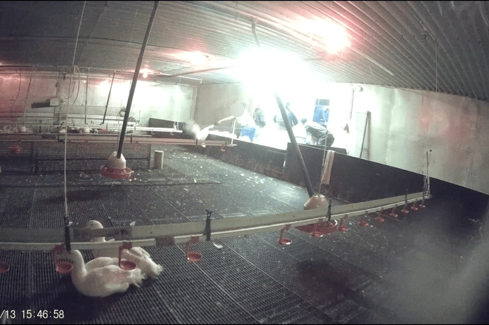 Mitarbeitende treten Enten mit den Füßen, werfen sie hunderte Male durch die Luft und packen sie grob an einzelnen Flügeln, um sie schließlich in Transportkisten zu stopfen. Allein im ausgewerteten Videomaterial wurden über 1.400 Tritte, mehr als 300 Würfe sowie rund 200 Fälle dokumentiert, in denen Enten an einzelnen Flügeln gepackt wurden – mit dem Risiko schwerer Verletzungen wie Flügelbrüchen. In mehreren Szenen wird zudem eine schwere Buchtwand mit voller Wucht wiederholt gegen Gruppen von Enten geschleudert, um sie schneller in Richtung Ausstalltor zu treiben. Dabei wird mindestens eine Ente schwer verletzt: Ihr Kopf wird beim Schließen der Buchtwand eingeklemmt, anschließend wird sie am Hals herausgezogen, zu Boden gedrückt und in eine separate Bucht geworfen, wo sie sich selbst überlassen wird.
