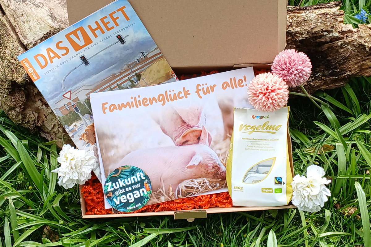 Für jede neu abgeschlossene Fördermitgliedschaft ab 10 € senden wir einer Person deiner Wahl eine von Hand gepackte vegane Geschenk-Box zu. Fülle bitte das entsprechende Online-Formular aus. Bitte trage im Nachrichtenfeld den Namen der beschenkten Person, sowie eine Adresse, an die wir die Geschenk-Box senden sollen ein. Die Aktion läuft vom 13.4. bis 26.4.. Ab dem 28.4. gehen die Pakete in den Versand und kommen rechtzeitig vor Muttertag am 15. Mai an.
