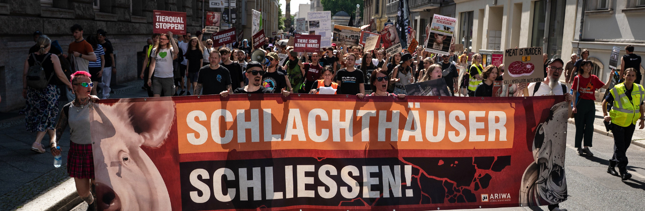 Zahlreiche Menschen setzen sich für die gesellschaftliche Anerkennung von Tierrechten und für pflanzliche Alternativen statt der Gewalt der Tierproduktion ein. In bis zu 15 Städten veranstalten wir jährlich die „Schlachthäuser schließen!“ Demonstrationen und ziehen laut und kämpferisch durch die Straßen. Unsere Forderung „Schlachthäuser schließen!“ steht symbolisch für alle Orte der Tierausbeutung: Mastanlagen, Eierfabriken, Pelzfarmen und Zoos.